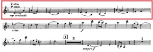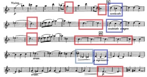 終盤のボウイング(青枠)↓も、重音でpをダウンボウで弾いていて、音質と音程が難しくニュアンスも出しづらいため、アップボウへ変更になりました。
